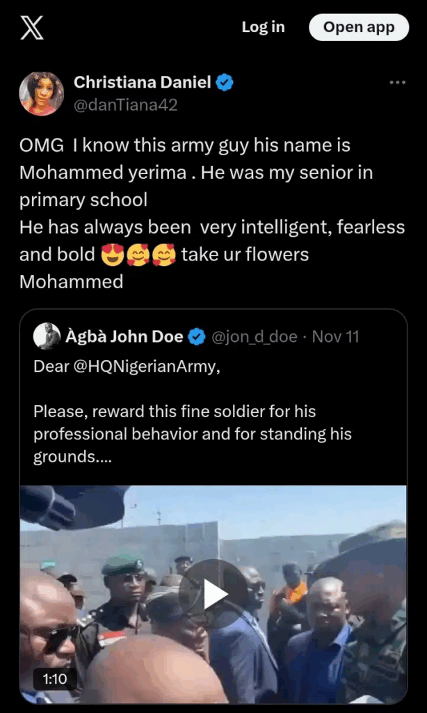 Her tweet reads, “OMG I know this army guy his name is Mohammed yerima . He was my senior in primary school. He has always been very intelligent, fearless and bold 😍🥰🥰 take ur flowers Mohammed”.
